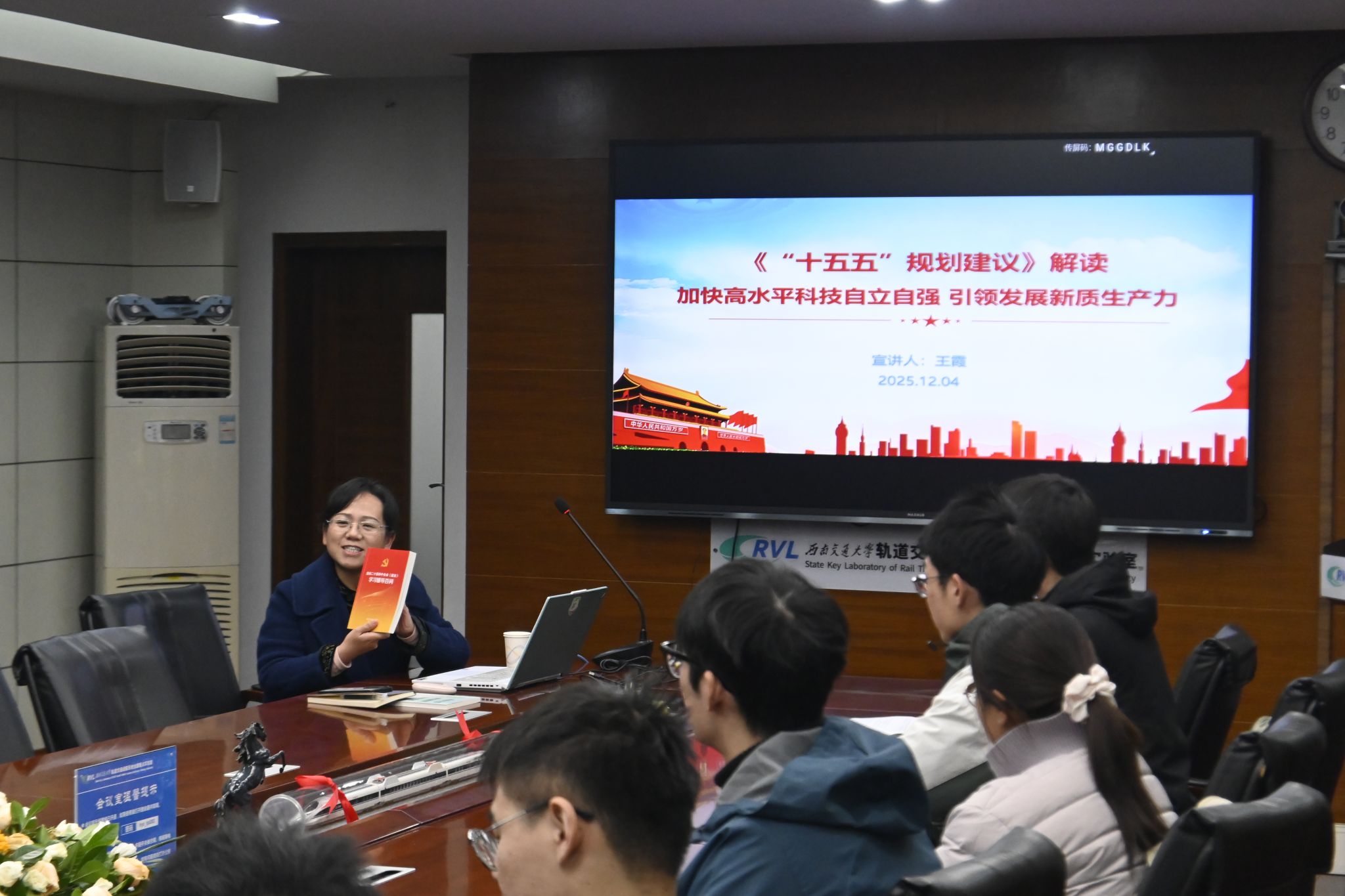 首先,王霞书记围绕“十五五”规划建议的核心内容进行了系统解读。她结合实验室在我国轨道交通发展中的使命与成就,深刻阐述了加快实现高水平科技自立自强、发展新质生产力的重大意义。王书记指出,作为国家战略科技力量的后备军,同学们生逢其时,重任在肩,必须将个人研究方向与祖国需要紧密结合,勇于挑战前沿科技难题。