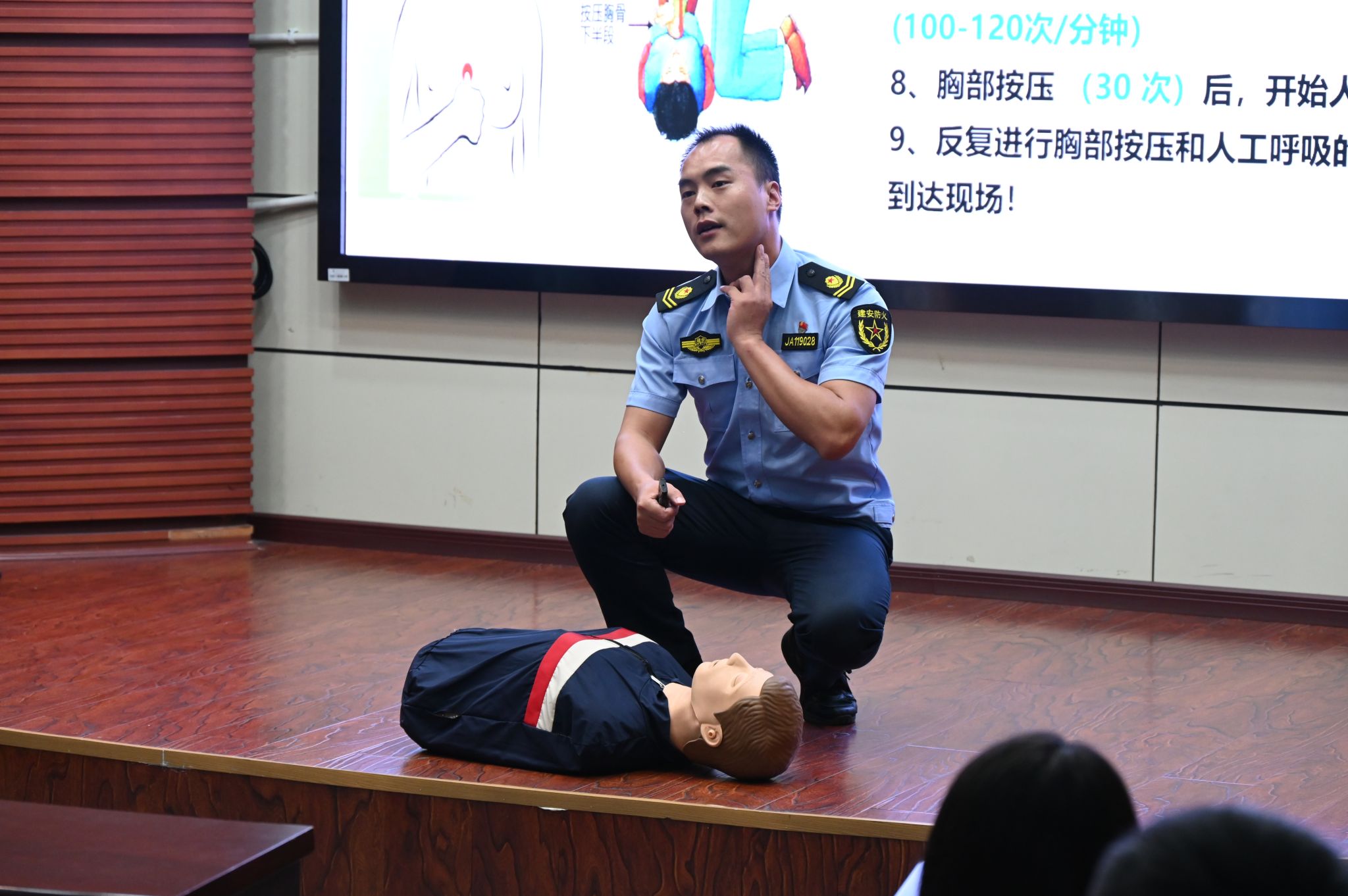 最后,培训进入实操培训环节。在消防器材使用环节,陈世扬教官重点讲解了灭火器的结构功能与操作关键,通过“提、拔、握、压”四字要领进行分步解析,并现场演示正确使用方法,帮助参训人员掌握灭火器的正确使用技巧。此外,培训还设置了假人急救(心肺复苏)实操教学环节,通过模拟真实场景,指导参训人员学习并实践心肺复苏技能,提升应对突发状况的急救能力。
