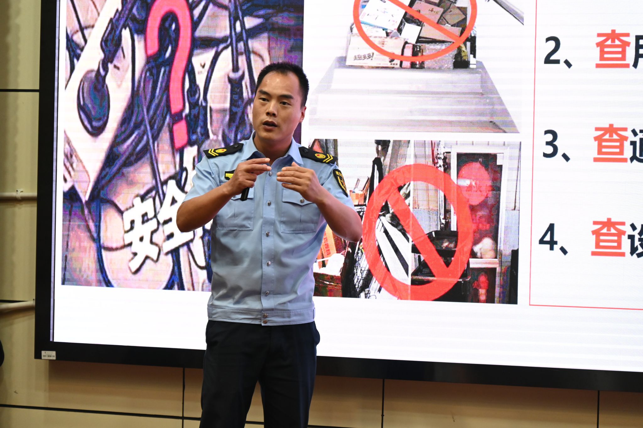 随后,陈世扬教官开展专题培训。陈世扬教官围绕新消防条例、全员安全责任制、近年全国火灾形势以及消防安全“四个能力”建设四个方面进行了系统讲解,通过典型案例分析和现场互动,帮助师生进一步认清身边安全隐患,提升防范与处置能力。