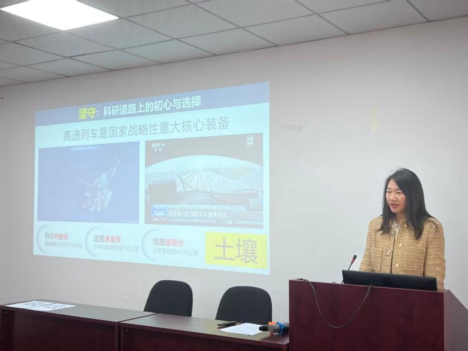 轨道交通运载系统全国重点实验室副研究员易彩老师以“坚守、创新与使命” 为核心,分享了所在科研团队深耕轨道车辆动态测试、服役安全保障及智能运维关键技术领域的科研历程。易老师结合团队攻克多项工程难题的实践经验,生动展现了面向国家战略需求的专业坚守与创新担当。