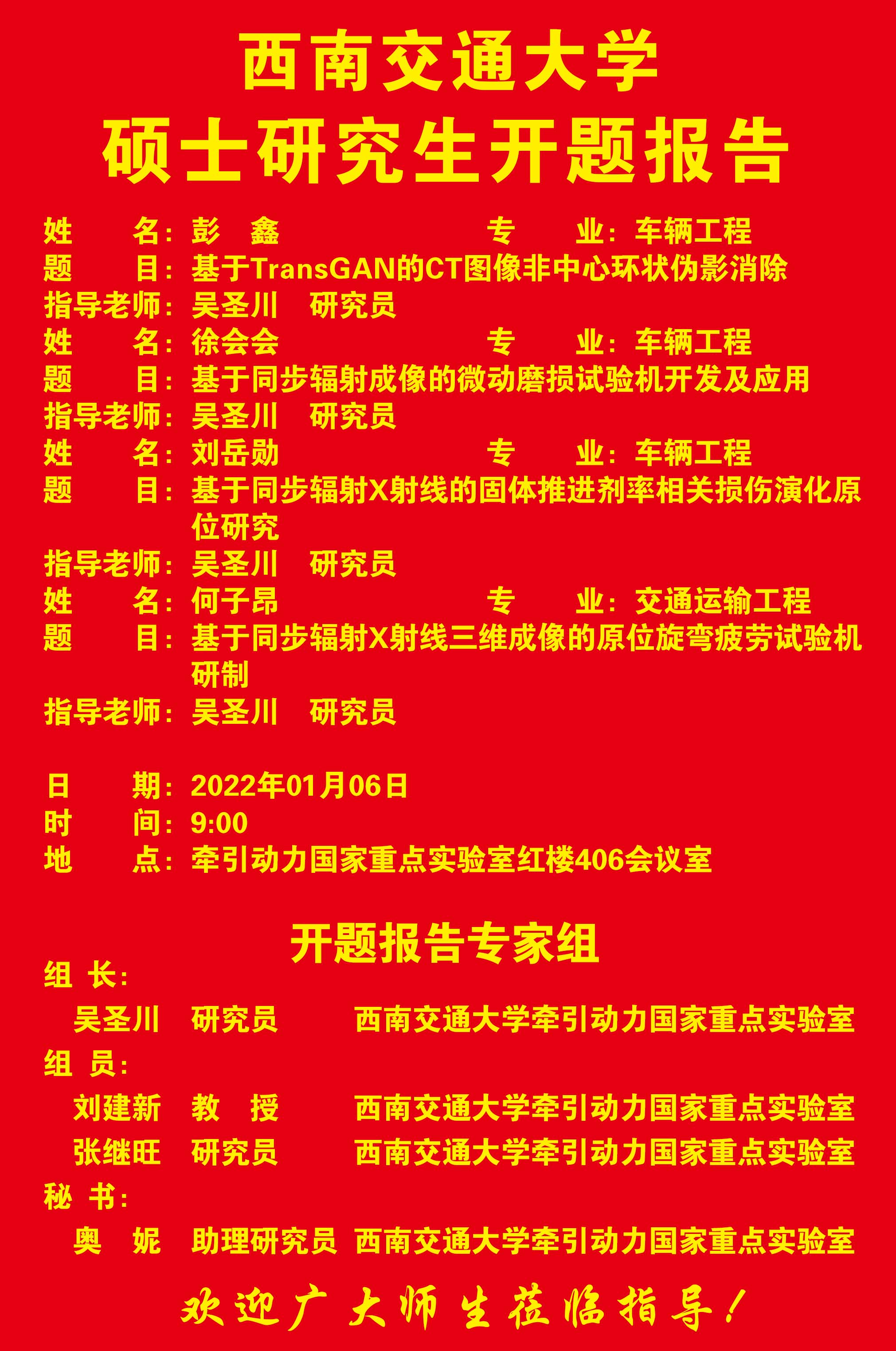 西南交通大学彭鑫、徐会会、刘岳勋、何子昂硕士研究生开题报告